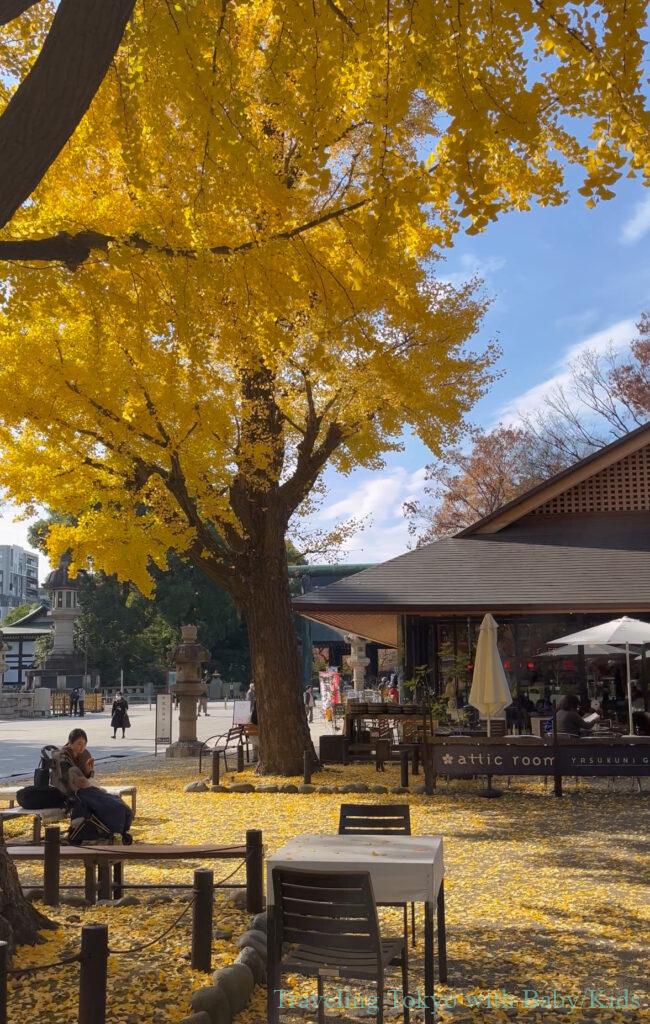 The grounds and surrounding areas of Yasukuni Shrine are home to impressive ginkgo trees. The serene and spacious environment offers a relaxing experience for families.