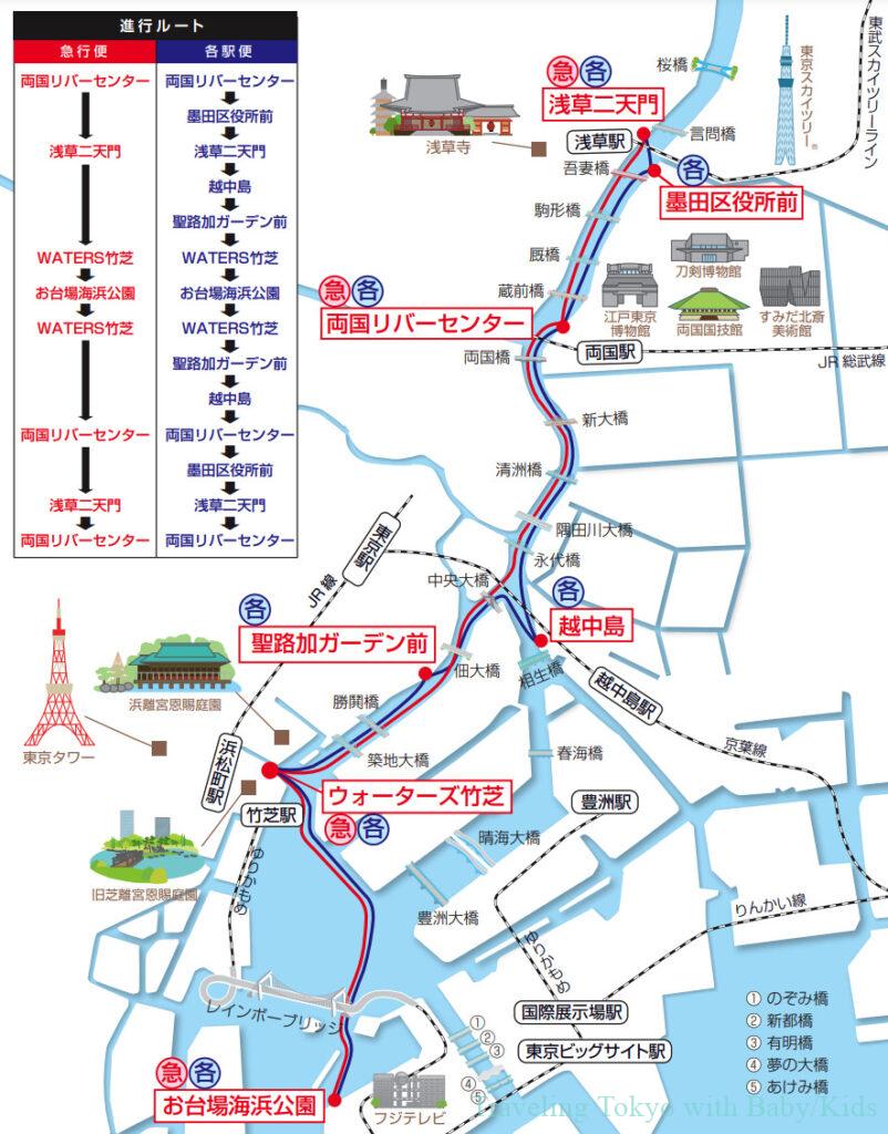 The best route I recommend for family is the one depart from Asakusa goes to Odaiba. (about an hour)