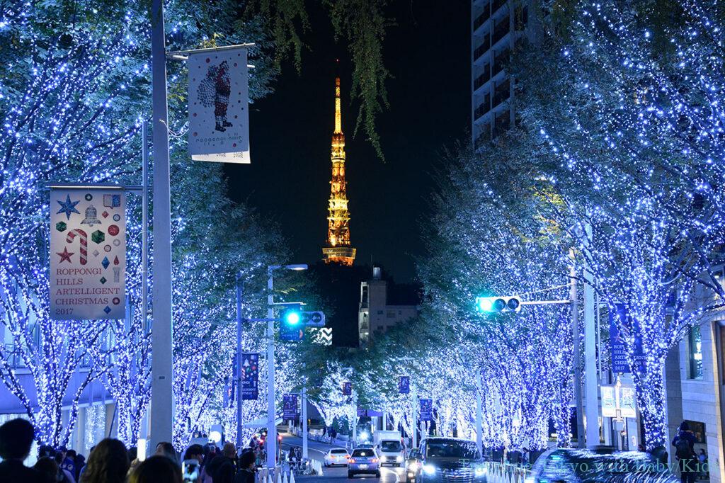 The iconic Keyakizaka Street in Roppongi features glittering white and blue lights, with the majestic Tokyo Tower in the background. This scenic spot is ideal for families to enjoy the beauty of winter illuminations.